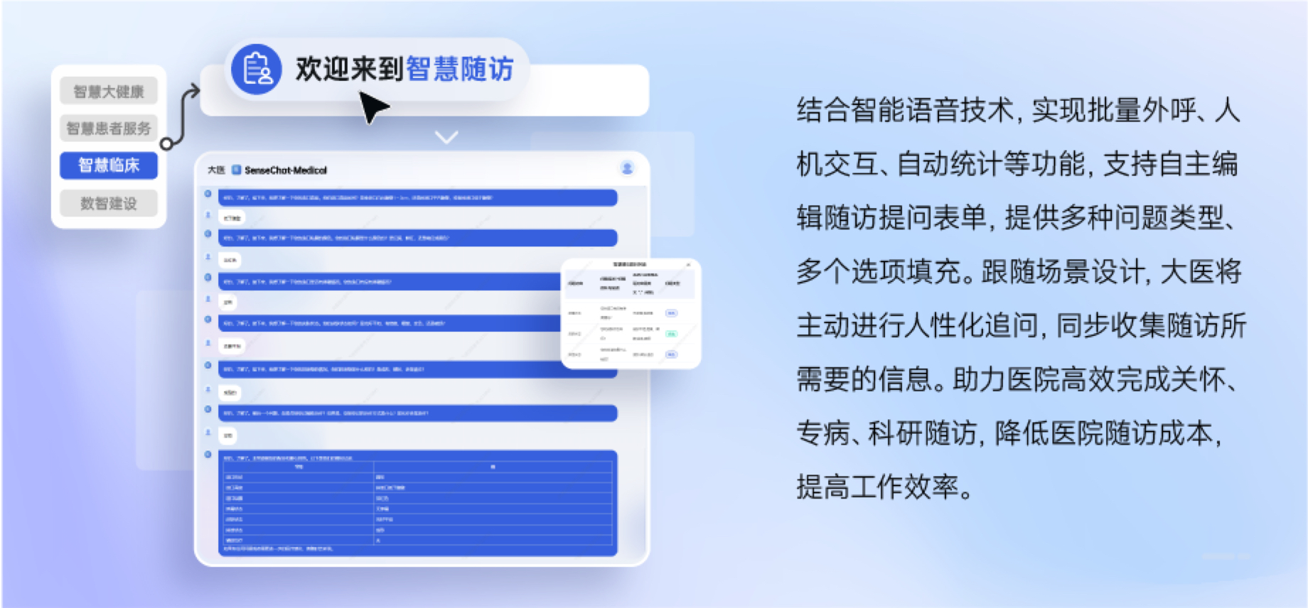 临床诊疗辅助:提供诊室听译机器人、临床辅助决策、电子病历生成、智慧随访等服务,提升医院临床诊疗效率,帮助医院降本增效。