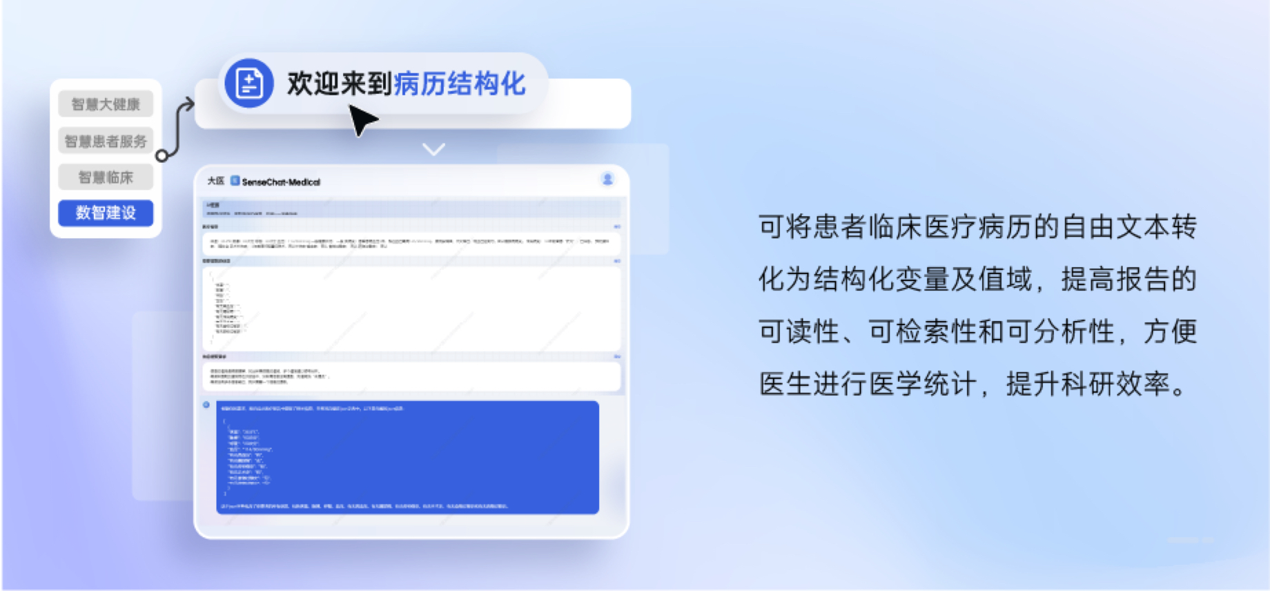 医学科研:提供影像报告/病历结构化、医学文献解读、医学统计辅助等能力,满足不同科室需求,辅助医生大幅提升科研效率。